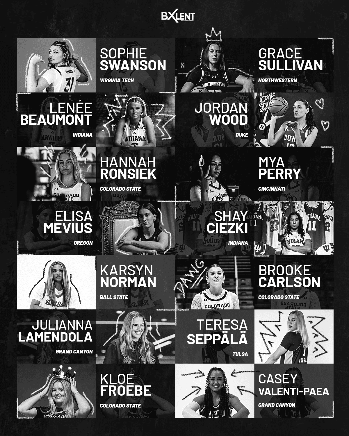 Strategic roster graphic for BXLENT athlete representation.
